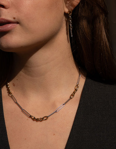 Die Fusion Chain Necklace vereint zwei Welten in einem Piece: kühles Silber trifft auf warmes Gold und verschmilzt zu einem cleanen, modernen Kontrast.