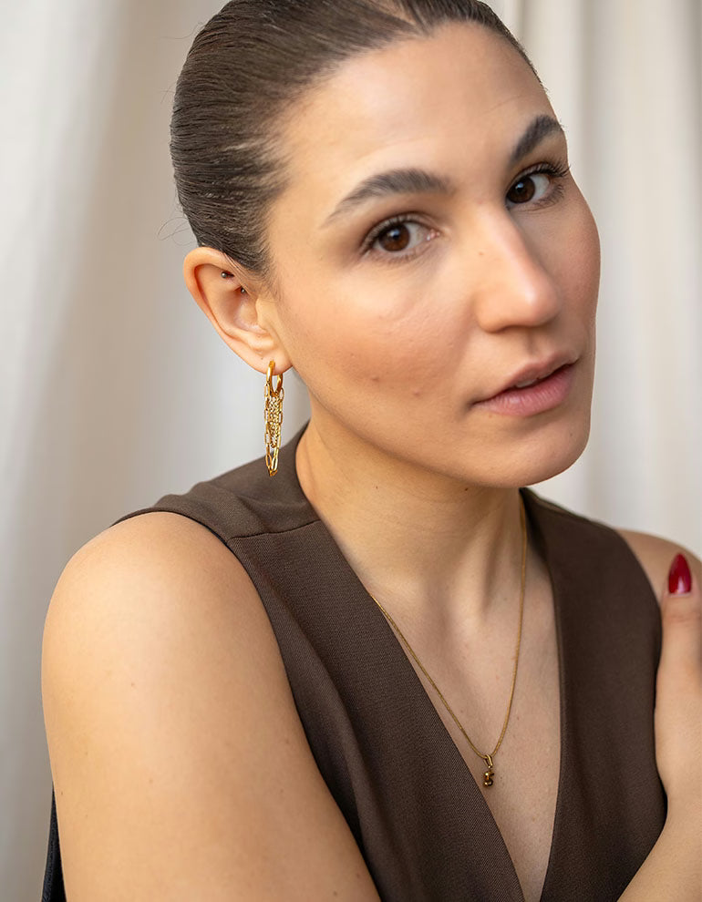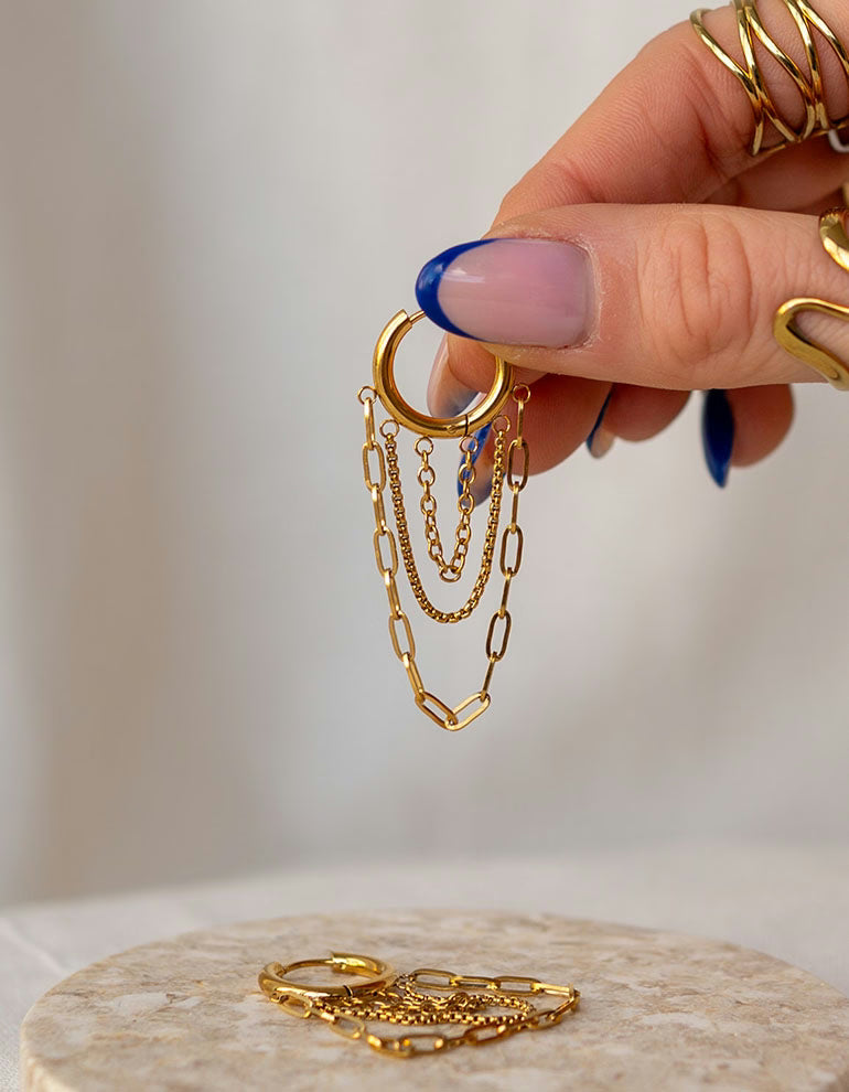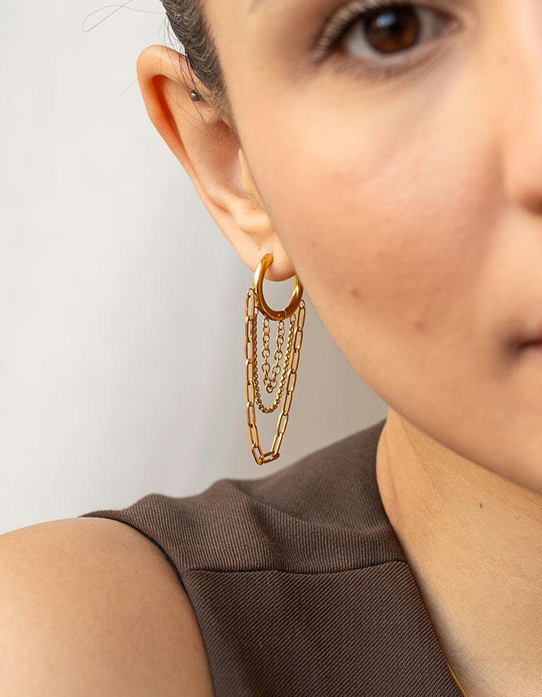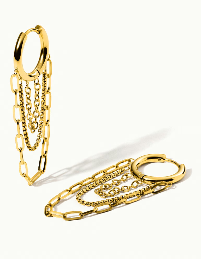 Unsere Chain Hoops bringen Bewegung in deinen Look. Die feinen, herabfallenden Ketten sorgen für einen eleganten, auffälligen Effekt, während die Ohrringe selbst angenehm leicht zu tragen sind.