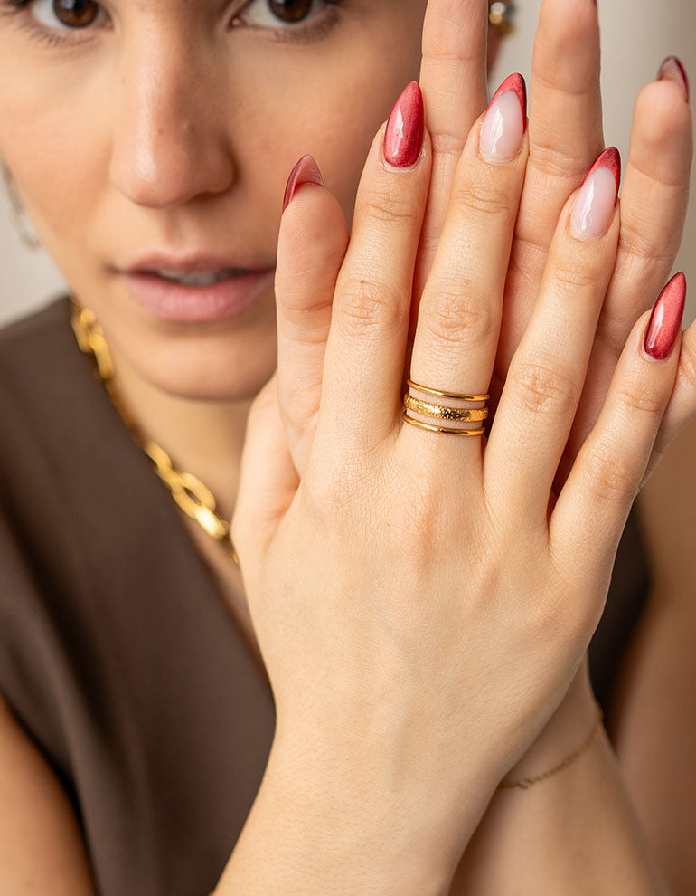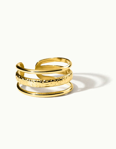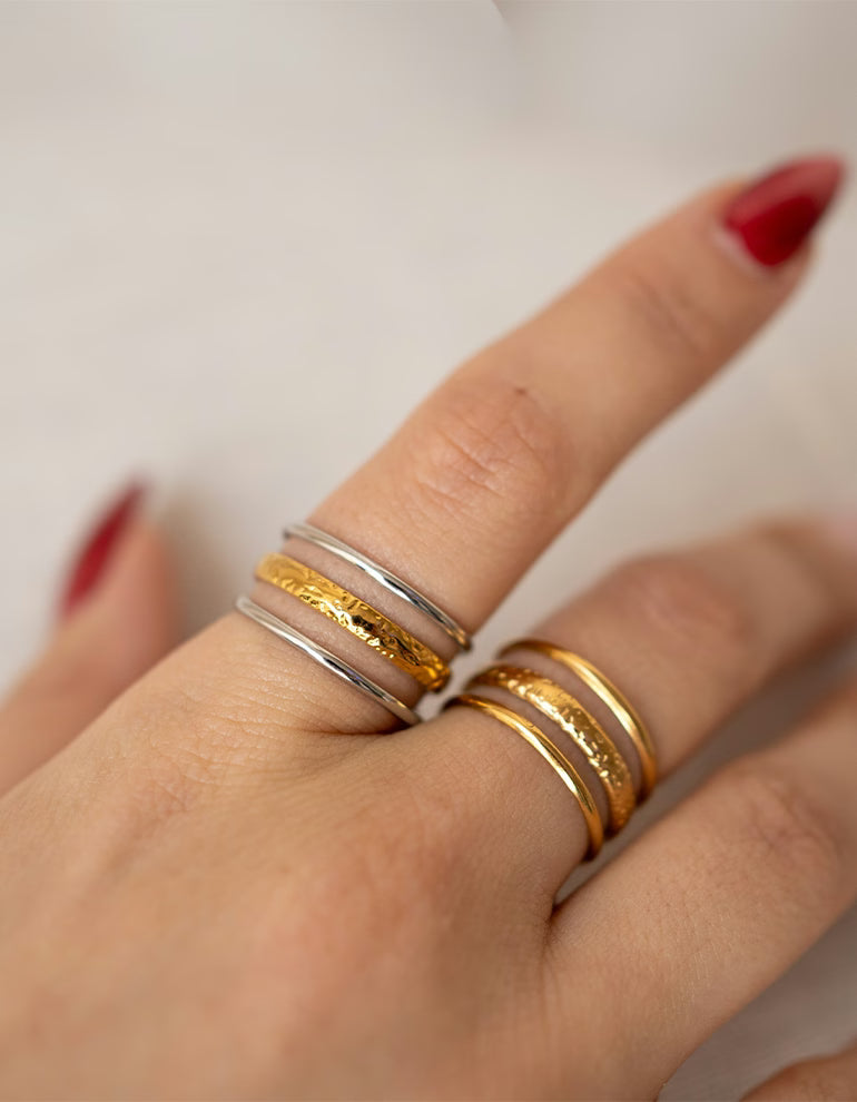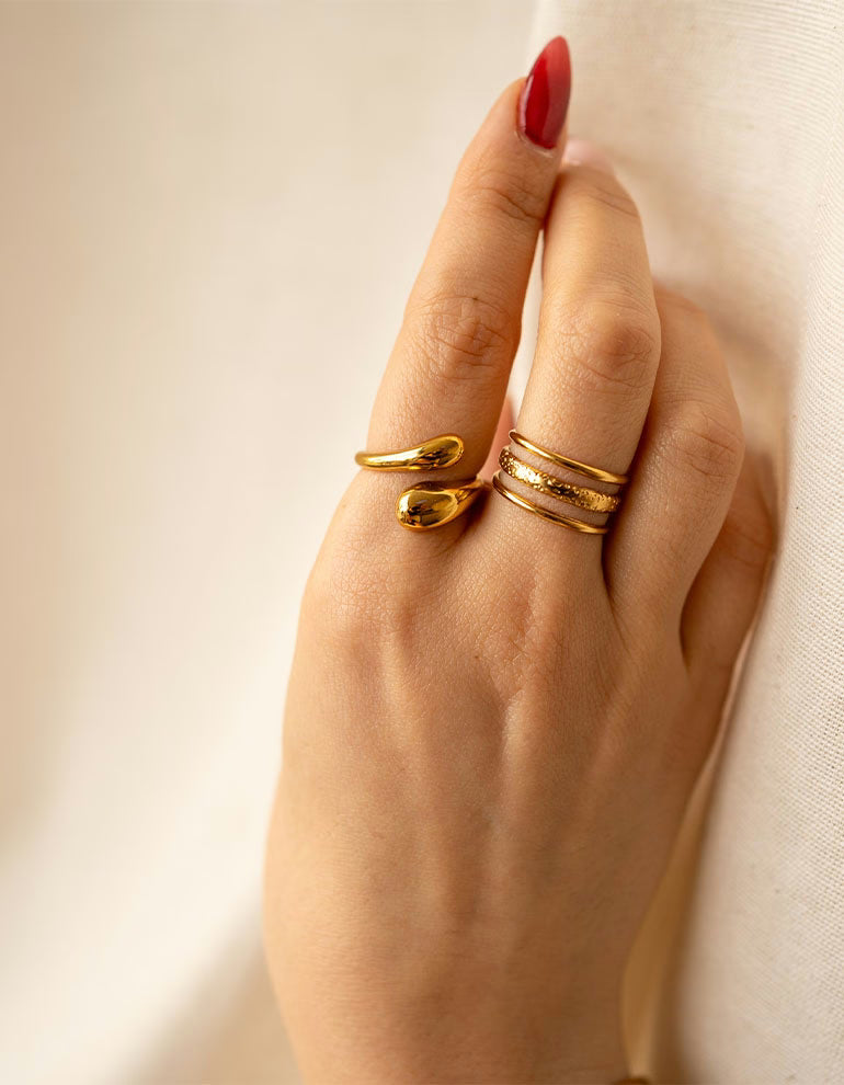 Thanks to its size adjustability, you can flexibly adjust the ring to wear it on any finger - ideal for creative ring stacks or as a solo statement. Made from robust, waterproof stainless steel with 18K gold plating, the Wavy Ring is durable and perfect for everyday wear.