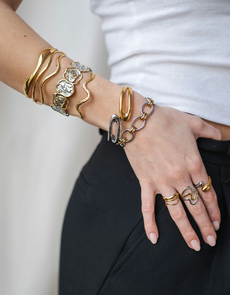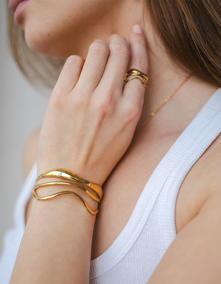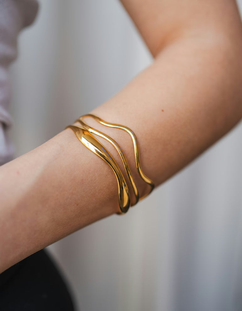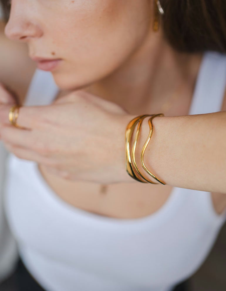 Die drei wellig verlaufenden Formen verleihen dem Bangle eine besondere Struktur und machen es zu einem stilvollen Statement-Piece. Gleichzeitig bleibt das Design minimalistisch genug, um es jeden Tag zu tragen.