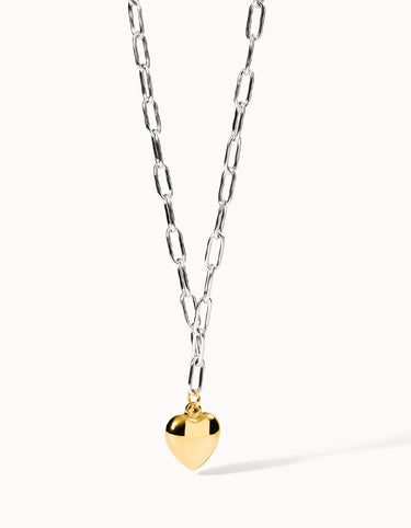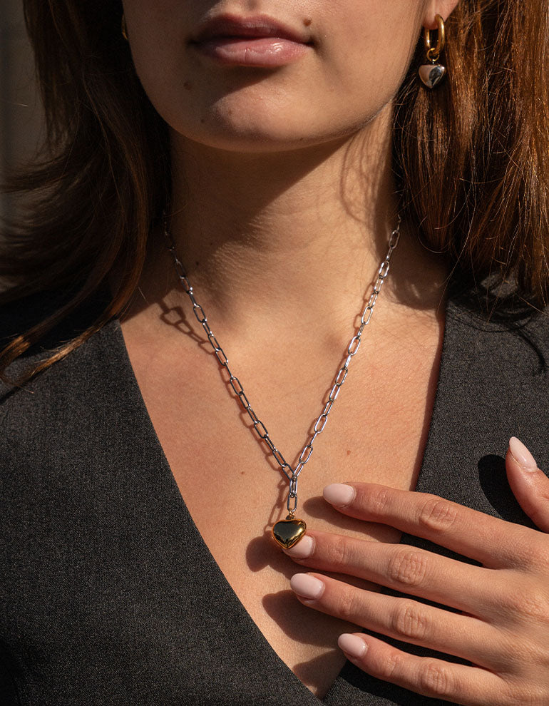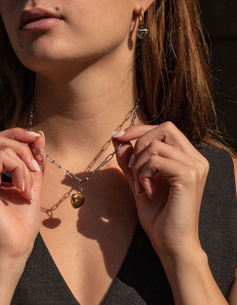 Die Iconic Heart Necklace vereint zarte Eleganz mit einem modernen Twist. Ein goldenes Herz an einer silbernen Gliederkette macht sie zum ikonischen Highlight – minimalistisch, edgy und ready to love.
