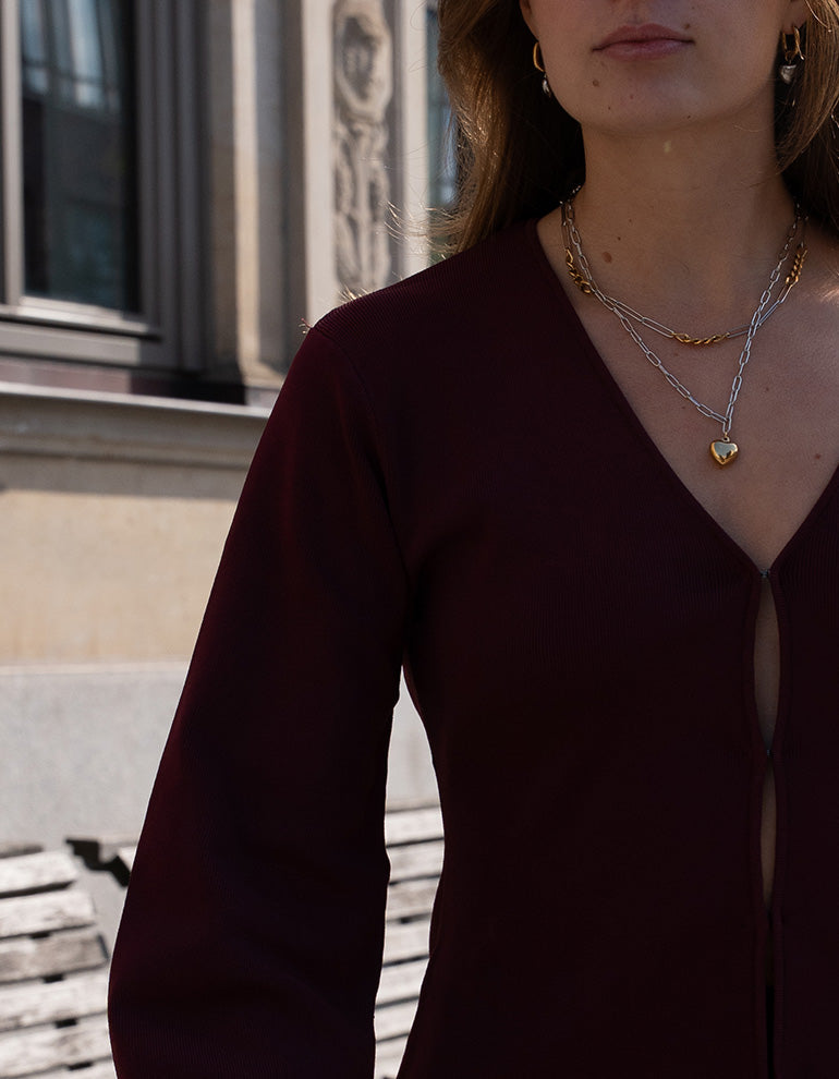 Gefertigt aus hochwertigem Edelstahl und 18K vergoldet, bleibt die Iconic Heart Necklace wasserfest, robust und farbstabil – ein Piece, das dich überall begleitet.